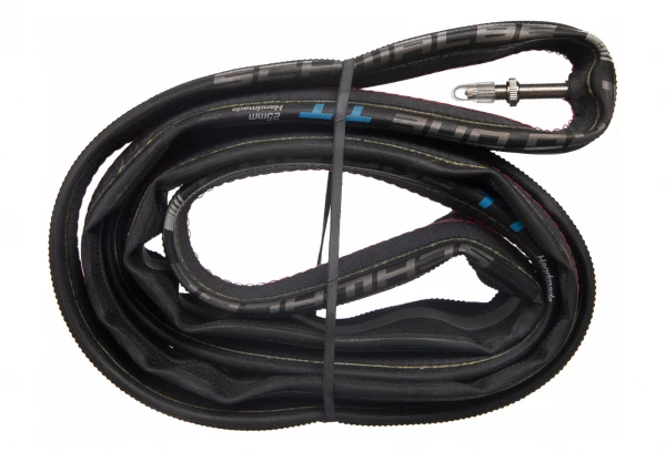 Sans compromis pour la compétition. TT est synonyme de vitesse, de résistance au roulement la plus faible et de poids minimal. Les caractéristiques de conduite sont incomparables. Le boyau Schwalbe Pro One TT à été unanimement reconnu par les coureurs professionnels.