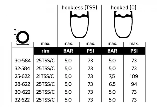 *Pressions indiquées pour une utilisation sur jante avec crochets(hooked).