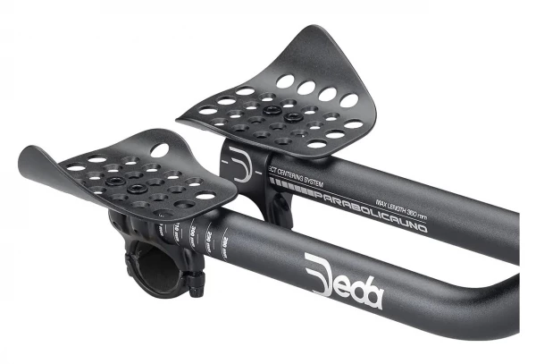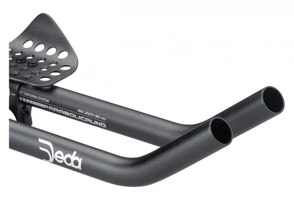 Le modèle Deda Parabolica Uno est la solution idéale et légère pour faire d’un vélo de route l’arme parfaite pour les courses contre-la-montre et les triathlons. Le produit se compose de trois éléments clés seulement ; les prolongateurs en J réalisés en aluminium 6061, les colliers en alliage forgé pour les fixer au guidon et les accoudoirs avec une bande velcro autoadhésive. Un kit spécial d’entretoises permet d’augmenter jusqu’à 55 mm la hauteur de l’accoudoir pour une position plus confortable et plusieurs possibilités de réglage. Le modèle Parabolica Uno est disponible dans deux versions. Une pour les guidons de 31,7 mm de diamètre et l’autre pour les cintres d’un diamètre de 35,0 mm. Le kit d’entretoises n’est disponible que pour la version de 31,7 mm.