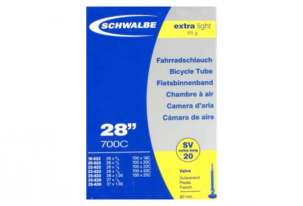 La chambre à air route extra light SCHWALBE SV20 Xlight est choisie pour son coté très light bien sûr et sa qualité. Pour pneus de 700 x 18 à 25.