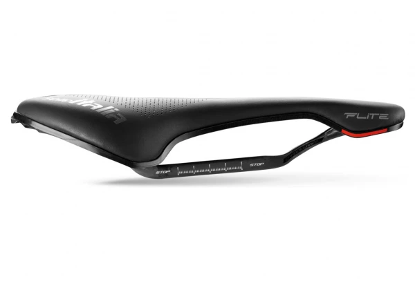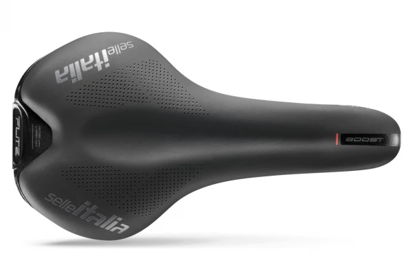 Le Flite Boost offre également des performances élevées grâce à sa forme compacte et aérodynamique. Son style se distingue par une version améliorée du logo Selle Italia sur les bords et une coupe dynamique, rappelant le rush de la pédale.