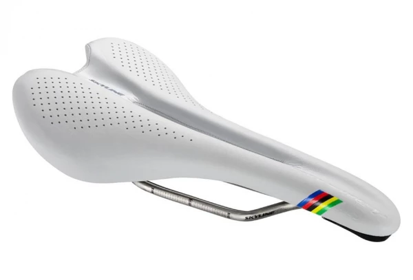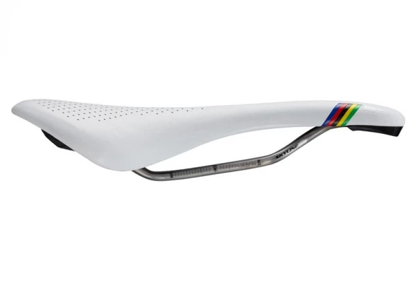 Selle en microfibre et titane de haute qualité, optimisée pour le confort, couleur blanche.