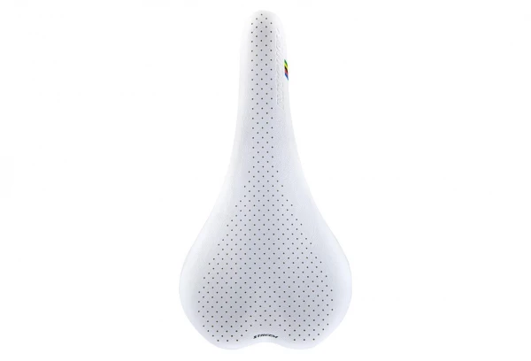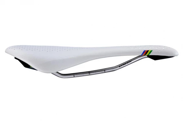 Selle en microfibre et titane de haute qualité, couleur blanche et largeur de 132 mm.